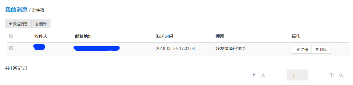 用户点击左侧导航栏“发件箱”,跳转至发件箱页面。系统将展示用户发送的信息列表。如图