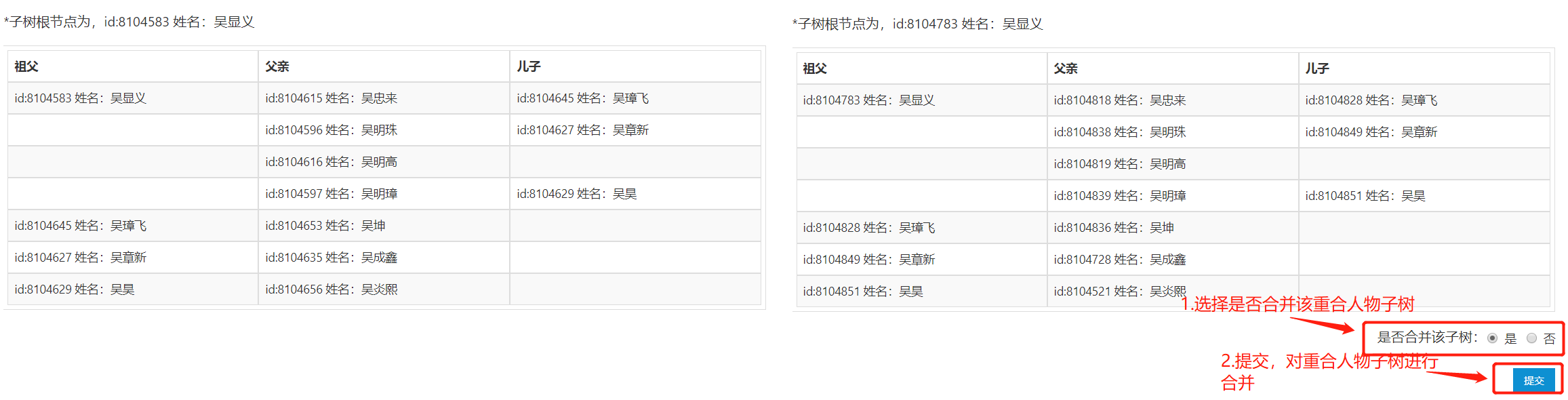 .所示。用户点击“待合并数据”按钮,跳转至“待合并家谱人物列表”,查看待合并数据,如图 .所示。用户点击“同意”或“拒绝”,对合并申请进行相应的操作。