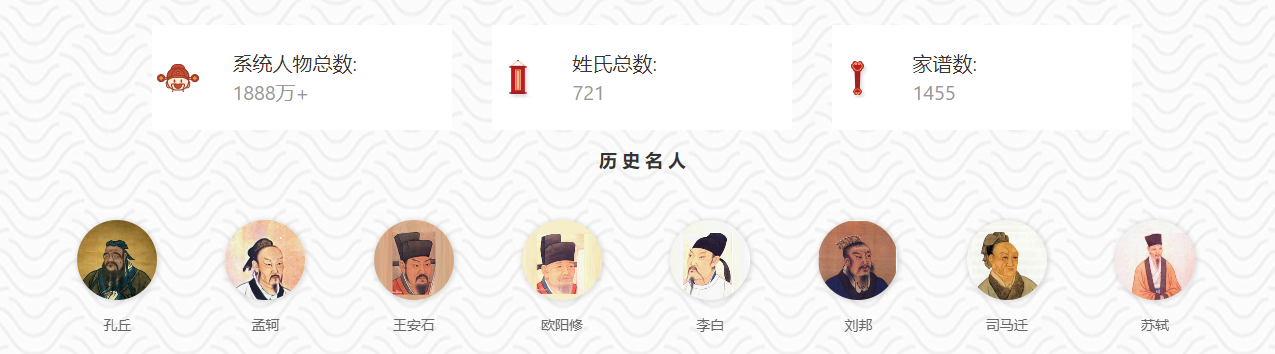 .所示。点击历史名人姓名,即可跳转到该名人的信息展示页面。例如,点击“孔丘”,跳转页面如图 .所示,双击人物节点可查看人物详细信息。 (2) 中华姓氏及公开家谱列表(前10):如图.所示。(3) “华谱网”微信公众号二维码。用户可以扫码后关注“华谱网”微信公众号,在公众号中通过微信登录后进入华谱系统。